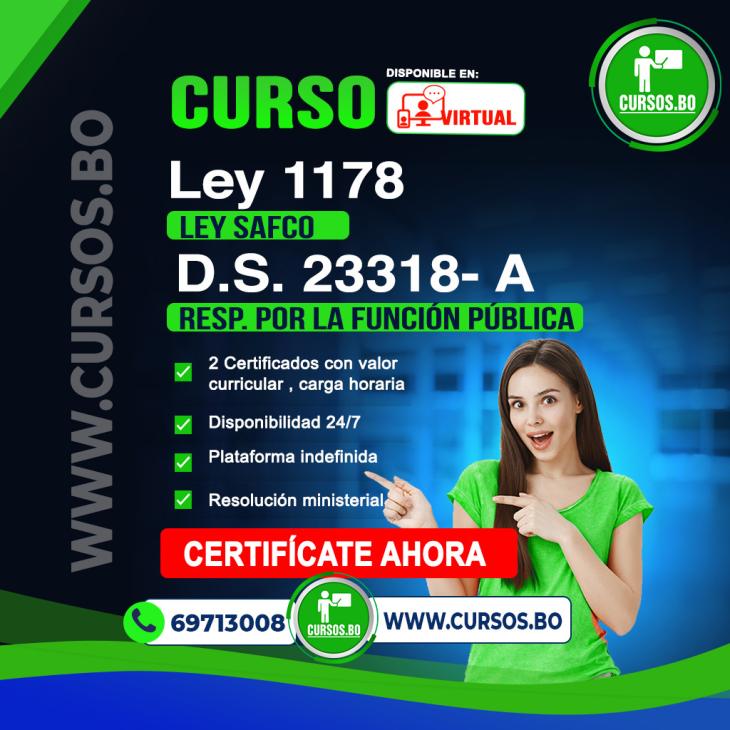 CURSO LEY 1178 (SAFCO) Sistema de Administración y Control Gubernamental y el DS 23318-A Responsabilidad por la Función Pública Incluye Últimas Modificaciones) Modalidad ON LINE(DISTANCIA) contiene 12 Modulos 6 horas Continuas o discontinuas 24/7